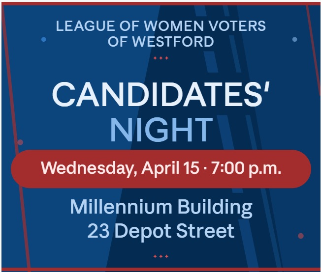 The League of Women Voters of Westford is hosting a Candidates’ Night on Wednesday, April 15, at 7:00 p.m. in the Millennium Building, 23 Depot Street, in Conference Room B. Candidates’ Night gives voters an opportunity to hear from those who are running in the May 5 Town election.